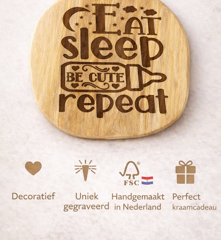 De planken zijn gemaakt van massief FSC-gecertificeerd hout, wat betekent dat het hout afkomstig is uit verantwoord beheerde bossen. Elke plank wordt met zorg gegraveerd, waardoor geen twee exemplaren exact hetzelfde zijn – dat maakt elk cadeau uniek.